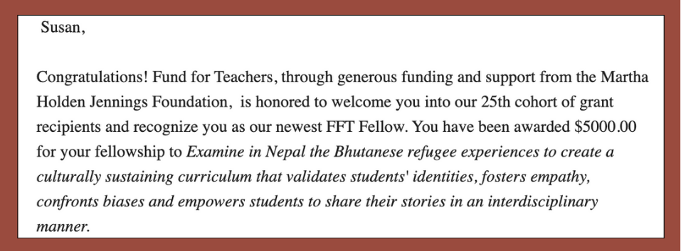 This wasn’t just a win for me. It was a win for every single one of them. For the kids who’ve taught me about Bhutanese culture, for the ones who’ve translated Nepali words during morning meetings, for the students who’ve told me their family’s refugee stories in whispers.
